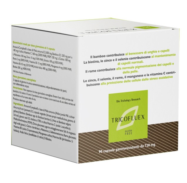 AnnurtriComplex mela annurca (Malus pumila Mill. cultivar Annurca) frutti (pomum) e.s. tit. in procianidina B2 0,02%, capsula vegetale (idrossi-propil-metilcellulosa, gomma di gellano), bamboo [Bambusa spp da Bambusa bambos (L.) Voss et Bambusa vulgaris Schrad.] giovani steli e.s. tit. al 70% in silice, vitamina C (acido L-ascorbico), metilsulfonilmetano (MSM), zinco gluconato; agente antiagglomerante: sali di magnesio degli acidi grassi; L-cistina cloridrato, L-metionina, L-seleniometionina, rame gluconato, vitamina B5 (calcio D-pantotenato), manganese solfato, vitamina B6 (piridossina-5-fosfato), acido folico (metilfolato di calcio), biotina.