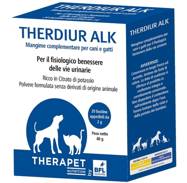 Mangime in polvere ad alto contenuto di Citrato di potassio formulato per il fisiologico benessere delle vie urinarie. THERDIUR ALK risulta utile in caso di un aumentato fabbisogno di potassio nella dieta (diminuzione dell’assunzione) o in animali soggetti ad ipokaliemia.
