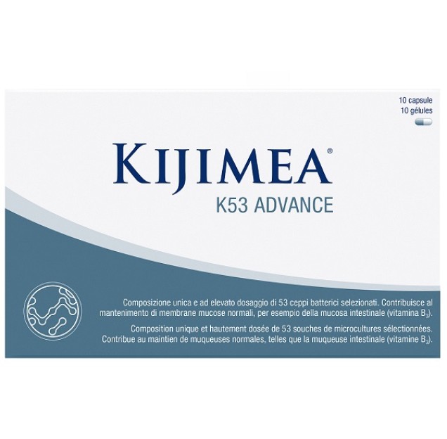 Integratore alimentare con 53 ceppi batterici selezionati. Una porzione di Kijimea K53 Advance contiene almeno 21 miliardi di microorganismi vivi. Inoltre Kijimea K53 Advance contiene le vitamine B3 e B7, che contribuiscono al mantenimento di membrane mucose normali.