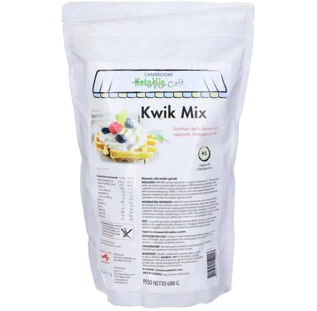 KWIK MIX deve essere assunto sotto controllo medico, non è adatto ad essere utilizzato come unica fonte alimentare, deve essere impiegato insieme ad altri ingredienti per la preparazione di pietanze come pasta, pane e biscotti per completare i fabbisogni nutrizionali nell’ambito di una dieta chetogenica. Deve essere somministrato soltanto a bambini dopo l’anno e adulti. Può comportare rischi per la salute se consumato da persone non affette dalla malattia per cui il prodotto è indicato. Non somministrare a adulti e bambini in buona salute.
